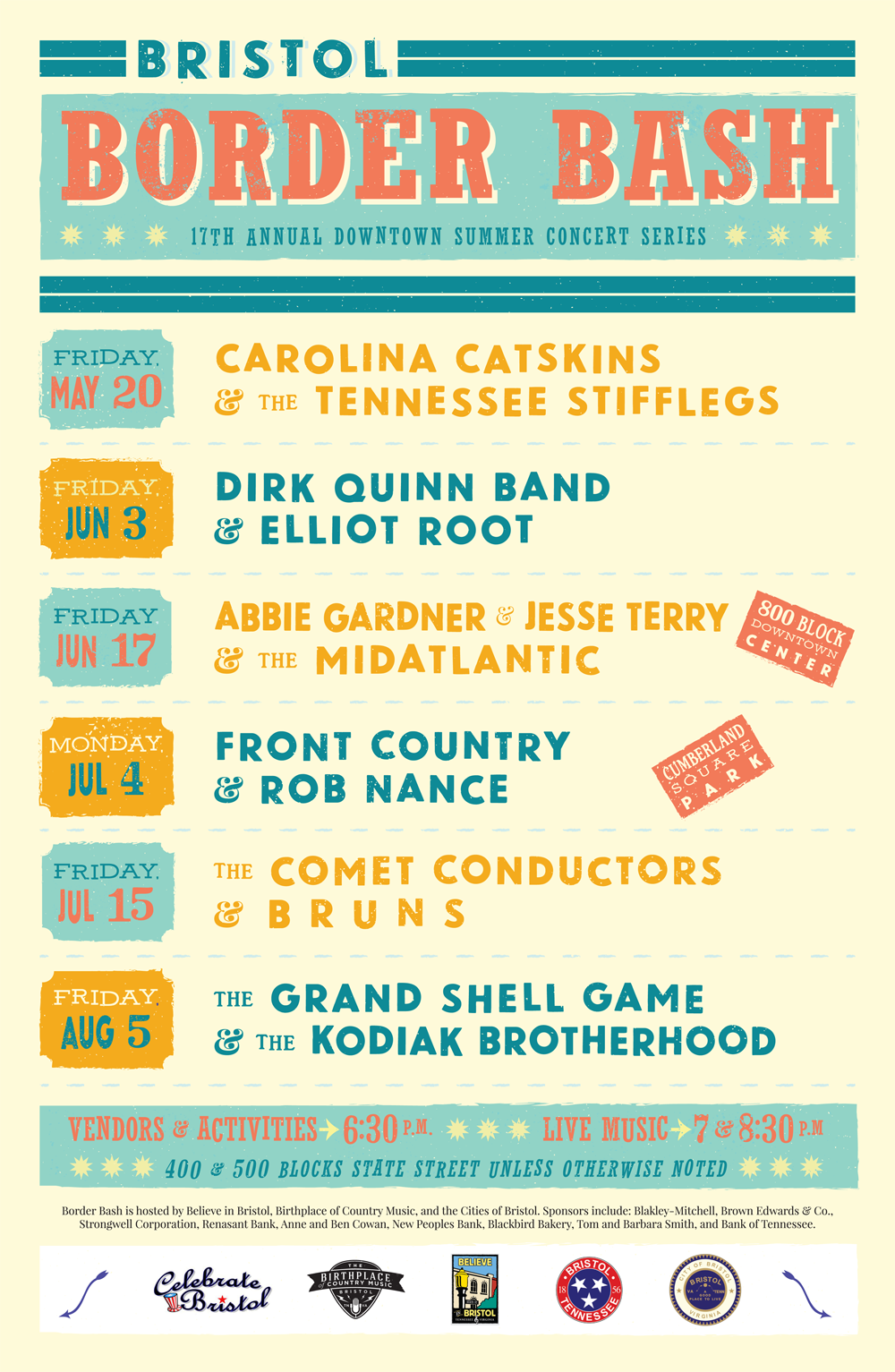 Border Bash takes place on State Street in Historic Downtown Bristol. Vendors and activities set up at 6:30 p.m. and live music begins at 7:00 p.m. Border Bash is a free community event supported by the Cities of Bristol, Virginia/Tennessee, Anne and Ben Cowan, Bank of Tennessee, Blackbird Bakery, Blakley-Mitchell Co., Brown, Edwards & Co., Camellia Digital, Coca-Cola Bottling Company, Express AV Productions, New Peoples Bank, Renasant Bank, Revolution Curbside Recycling, Strongwell Corporation, The Bristol Hotel: McCall Capital, LLC, Tom and Barbara Smith/ Merrill Lynch, Tri City Tent and Event, Walling Distributing, Wells Fargo and media sponsors Bristol Herald Courier, WBCM Radio Bristol, 99.3 The X, Electric 94.9 FM, WCYB-5, and WXBQ 96.9 FM.