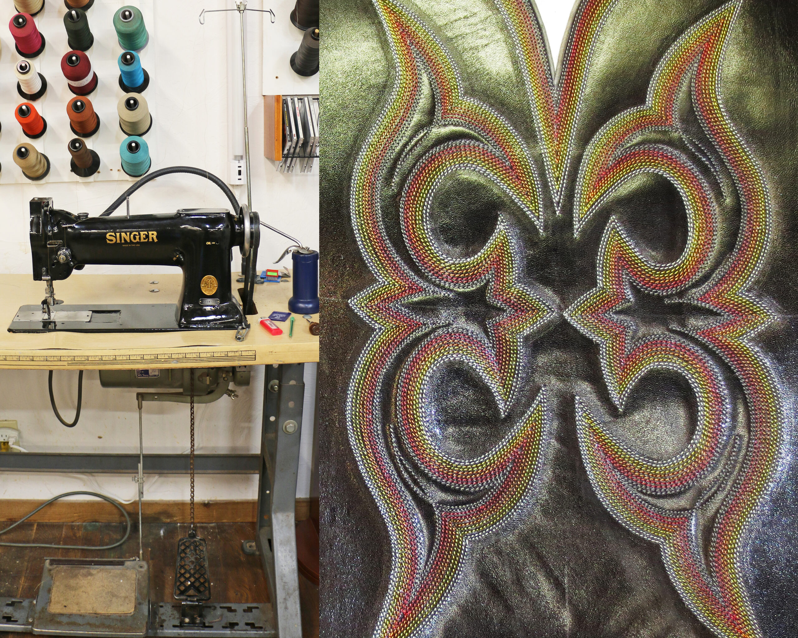 The original embellishment to grace the tops of cowboy boots, the least expensive and the most common, is DECORATIVE STITCHING. The stitching can range from one single row to around ten rows. In my shop, the rows of stitching are done one row at a time on a single-needle, uncomputerized sewing machine. The machine that I personally use is a Singer from the 1940s. In this example, you can see ten rows of stitching, done on my old Singer.