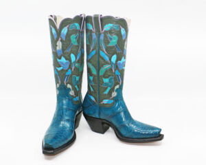 The first design technique that includes additional pieces and colors of leather, in addition to stitching, is INLAY. If you cut out a hole, such as a star, a flower, or a butterfly, and you put a different color of leather behind that hole, that’s inlay. It wasn’t long before cowboy boots sprouted colorful inlaid flowers and butterflies. It’s important to note that flowers and butterflies are traditional themes for cowboy boot tops. They were not considered feminine; they were simply common and accepted boot designs.